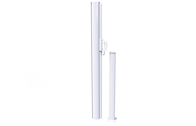 Ce store latéral procède un coffre intégral en 100% aluminium qui abrite et protège la toile et le mécanisme dans leur intégralité. Même lorsque la toile est déployée on ne voit pas le mécanisme à l'intérieur. Le poteau récepteur quant à lui est également en 100% aluminium extrudé et mesure 1 M de hauteur.